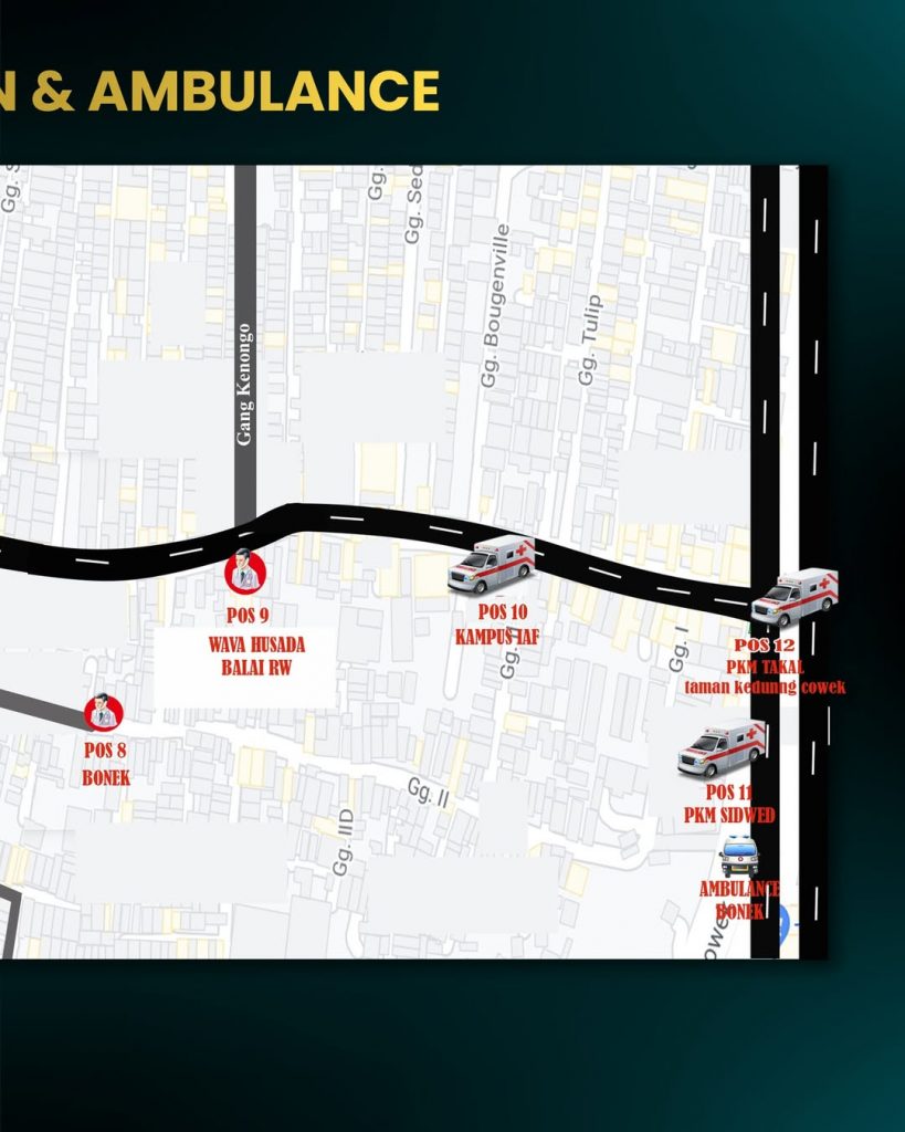 - Dukungan mobil ambulance siaga di jalur cepat untuk evakuasi darurat