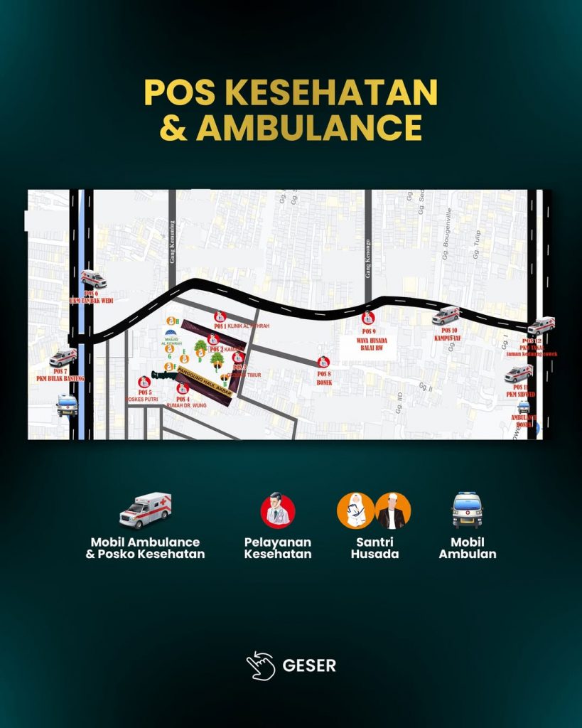 Setiap posko dilengkapi dengan tenaga medis, santri husada, serta peralatan pertolongan pertama, dan terhubung langsung dengan jalur ambulance untuk penanganan lanjutan apabila diperlukan.