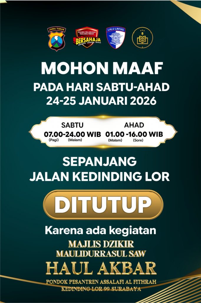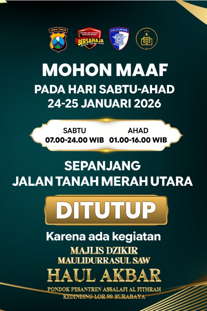 Sehubungan dengan digelarnya kegiatan “Majlis Dzikir Maulidurrasul SAW & Haul Akbar” di Pondok Pesantren Assalafi Al Fithrah, diberitahukan kepada seluruh pengguna jalan bahwa akan dilakukan penutupan arus lalu lintas pada: